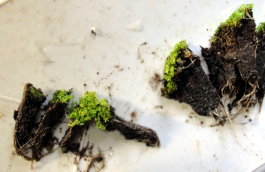 note que mesmo cortadas as mudas estão unidas ainda e cada carpete rendeu 16 cubinhos de 1 cm, e mais alguns pedaços que acabam se destacando ao puxar