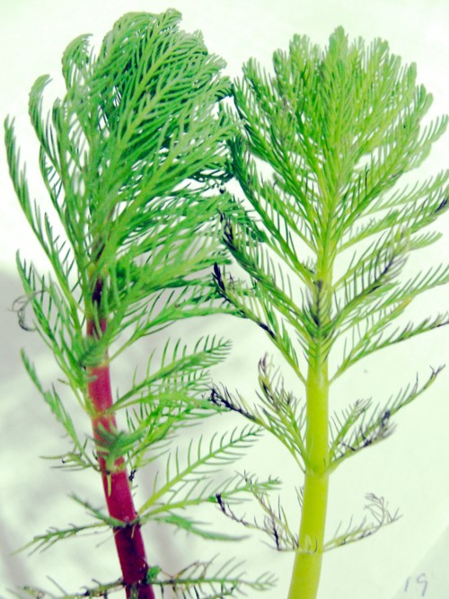 é uma planta que sempre tende a ficar emersa, mas se mantivermos podas antes que a emersão ocorra ela cresce com menos rapidez à superficie.e aos poucos vai diminuindo a tendencia a emersão com bastante iluminação fica bem vermelha As Myriophyllum são plantas pouco exigentes e se mantem mesmo sem o plantio no fundo, pois conseguem retirar nutrientes da água |