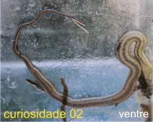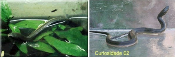 Nome cientifico: Helicops modestus Nome comum: cobra d'água Características:Não peçonhenta, prefere se alimentar de girinos e mussuns, ao inves de peixes com escamas.