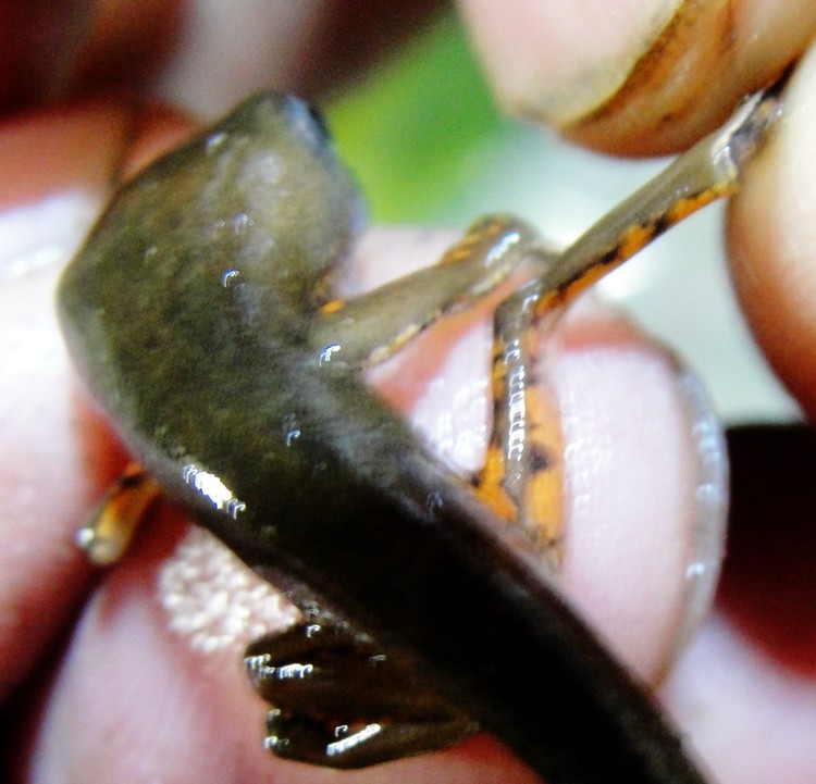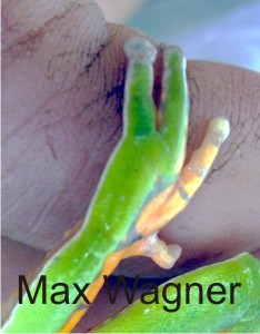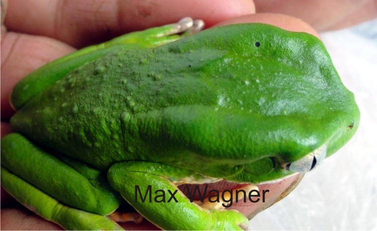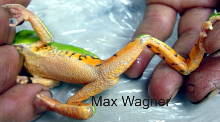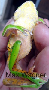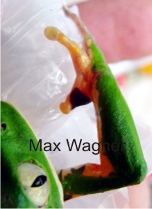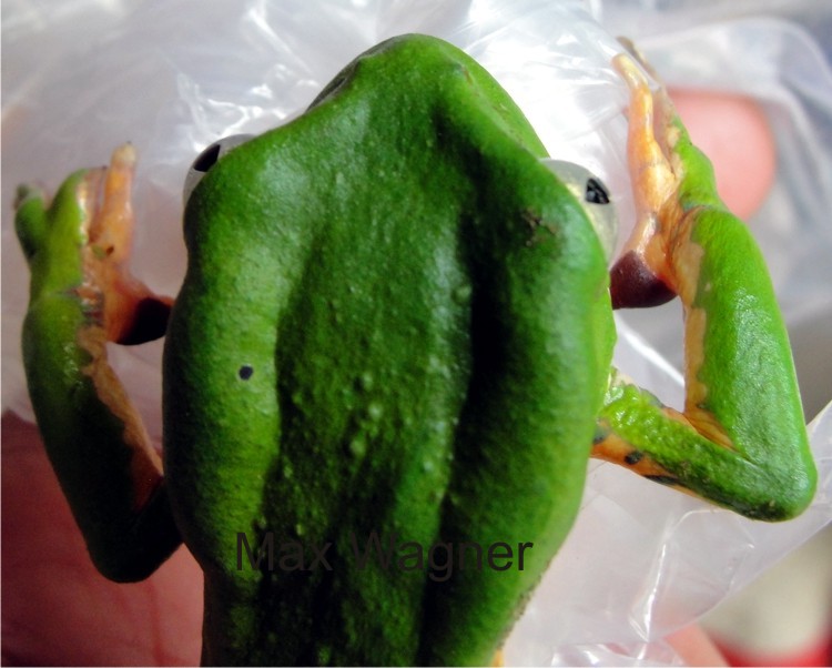 Em dezembro de 2011 efetuamos uma coleta para tentar classificar as phyllomedusas que ocorrem na reserva por meio de genotipo, com a colaboração de pesquisadoras, e segundo eles se trata da Phyllomedusa tetraploidea