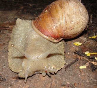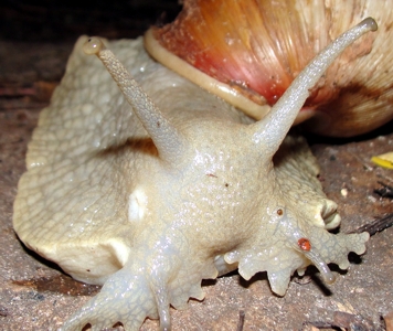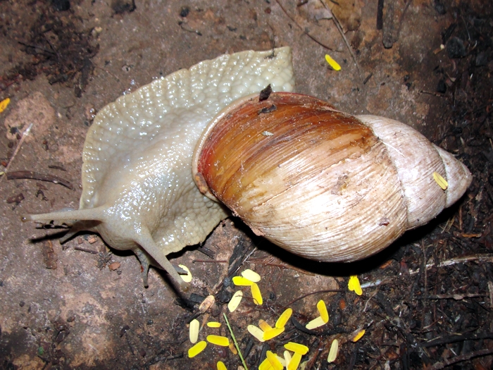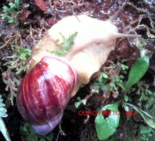 confirmar. Tem hábitos crepusculares (em dias umidos) ou noturnos, e tem como predadores naturais os Teiú (Tupinambas sp.) e a ave Coró-coró (Mesembrinibis cayennensis) ambas predam tambem os Achatina fulica, que atualmente acabou virando praga. EXISTE NO BRASIL, um caracol que tem a concha bastante parecida ao Achatina em cor , mas a concha é mais curta e o pé pode ser branco, ou ainda cinza claro - portanto antes de eliminar os caracois que se pareçam com os invasores ACHATINA confira se a concha é mesmo alongada e o pé é mais escuro que esses nossos nativos