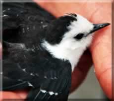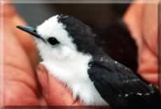 Características: é um pequeno pássaro de cor negra escura na região superior do corpo(inclusive o bico) e branco nas regiões inferiores, inclusive da asa.