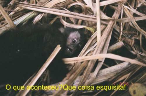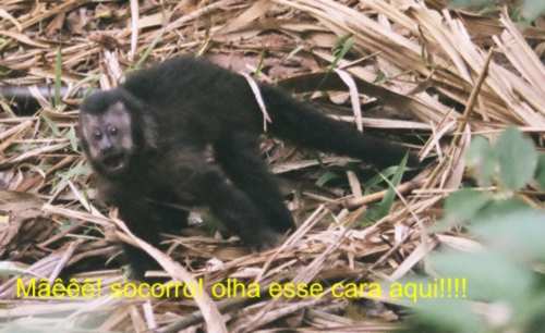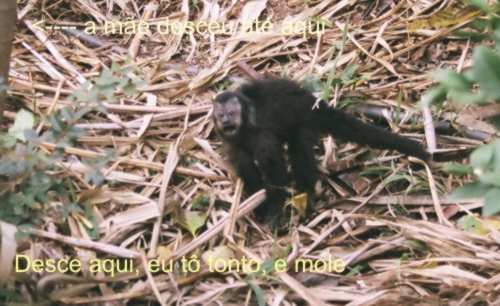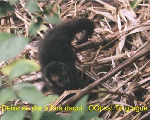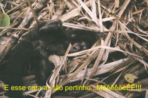 ....e continuava gritandopara a mãe que estava em um arvore próxima, como que tentando dar apoio moral a ele, respondendo aos seus chamados, e ele seguindo o chamado da mãe achou a arvore onde ela estava e rapidamente (a medida do possivel) conseguiu chegar a té ela, e aos poucos ambos foram se afastando dali.