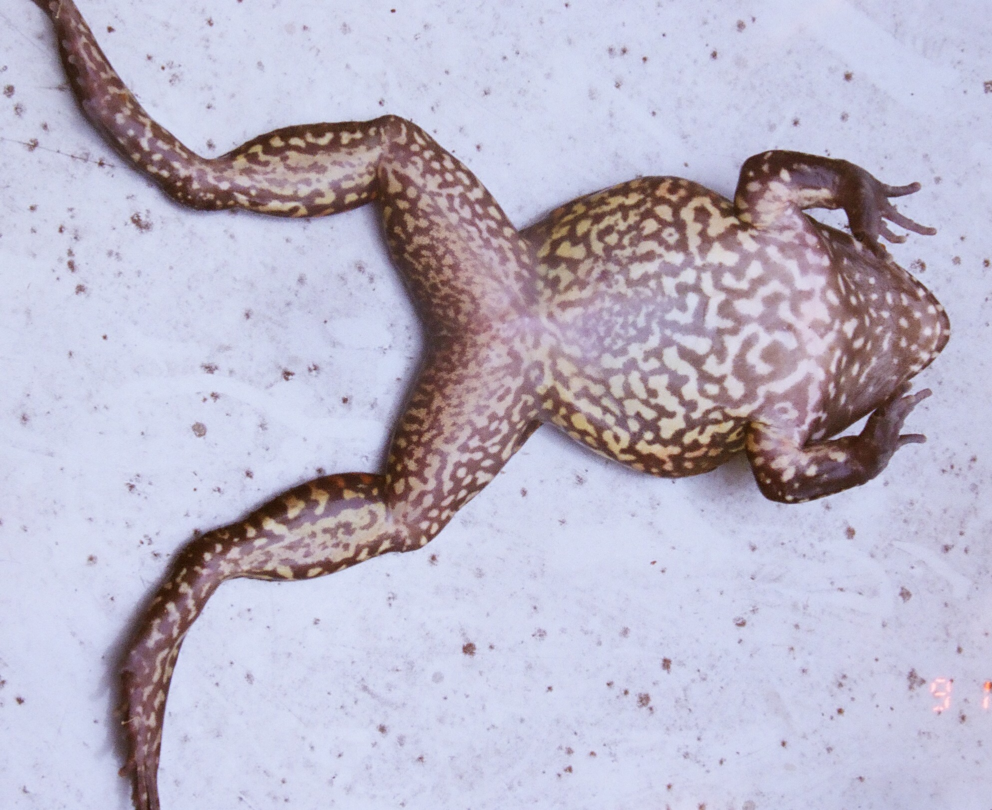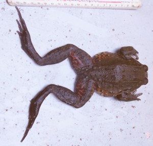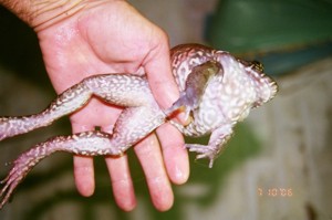 Características: rã de grande porte, embora perdendo em tamanho para a rã-touro(Rana catesbeiana) Reprodução:A fêmea põe seus ovos em ninhos de espuma, dentro de depressões na lama de margens de coleções de água , que cava com a ajuda do macho.Entretanto nem todos ovos são fertilizados por ele, e assim a maioria (89 a 97 % dos ovos ficam sem fertilização (chamado de ovos tróficos), mas tem ao que parece a função de garantir a alimentação dos girinos que nascem caso a agua da chuva não carregue os girinos para outros lugares com alimentação, como lagoas próximas, e com isso garantindo maior tempo de sobrevida aos girinos. Ainda não é infelizmente cultivada comercialmente por ser menos produtiva que a rã-touro, em proliferação e crescimento.Digo infelizmente porque por falta de estimulo comercial ela acaba não sendo estudada, e pela degradação de seus ambientes naturais pode acabar sendo extinta. Curiosidades:Os anfibios em geral tem muito senso de localização, e um exemplo disso aconteceu com este exemplar macho fotografado. Eu o coletei eu uma caixa de criação de peixes de concreto que tinha dentro uma caixa de cultivo de plantas(simulando uma margem alagada). Para evitar que ela como é hábito, devorassem os peixes que reproduzia ai(elas ingerem muitos peixes antes da desova parecendo que assim pretendem diminuir a concorrência com seus girinos, ou até diminuiri a predação deles), coletei e coloquei em saco plástico na geladeira para provocar uma hibernação até que pudesse fotografá-lo.E assim ele acabou ficando por 2 dias dormente, efetuei as fotos, e para tentar mantê-lo vcivo mas longe, efetuei a soltura a 500 metros da caixa escolhida por ele, nos ultimos tanques da piscicultura, e como ainda estava meio imóvel o protegi com folhas para evitar que fosse capturado por algum predador. Mas qual não foi a surpresa quando ao anoitecer já pude ouvir sua vocalização, novamente na mesma caixa. O mesmo ocorre com sapos e pererecas, são muito teimosos, depois de escolherem o local da desova, e sempre escolhem caixas que tem mais fito e zooplancton disponíveis. Se alguém tiver alguma informação, favor entrar em contato xamrenga@ig.com.br |
