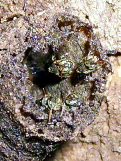 Detalhes e caracteristicas - É uma abelha muito tímida, e para poder efetuar a foto com elas na entrada foi preciso chegar pisando bem macio, pois ontem ao visita-las elas sumiram dentro do canudo e ninguem mais se atreveu a aparecer, apenas as campeiras entravam de vez em quando, mas ninguem saiu por todo tempo que estive ali por perto. E em 2 visitas a elas não consegui ver nenhuma saindo depois da aproximação