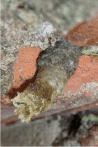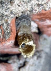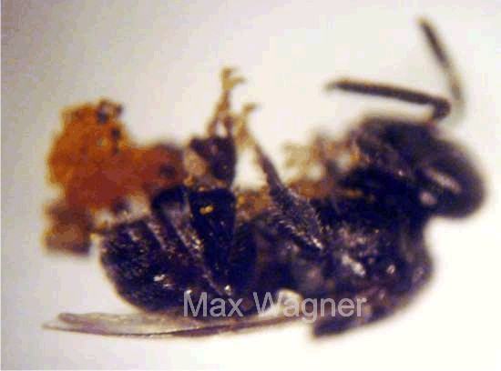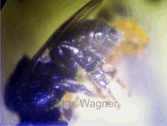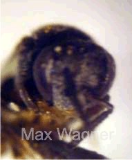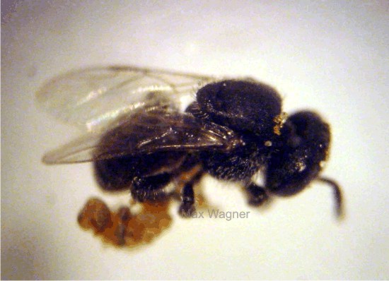 Abelha minúscula medindo apenas 3 mm de comprimento, que se alojou em uma lajota de teto de casa de bomba na reserva, e quase passa despercebido devido a seu diminuto tamanho de entrada
